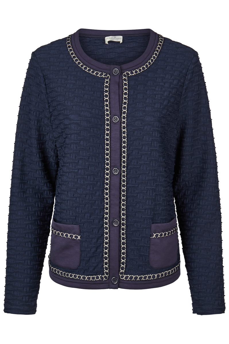 Klassinen Chanel-henkinen jakku on aina muodissa! Yksinkertaisen hienostunut tummansininen jakku sopii asuun kuin asuun. Tässä Barbara Lebekin jakussa on kauniit koristenauhayksityiskohdat, jotka tuovat ripauksen luksusta pukeutumiseen. Jakussa on täyspitkät hihat, pyöreä pääntie ja etutaskut sekä edessä napitus, jolla jakun saa suljettua.